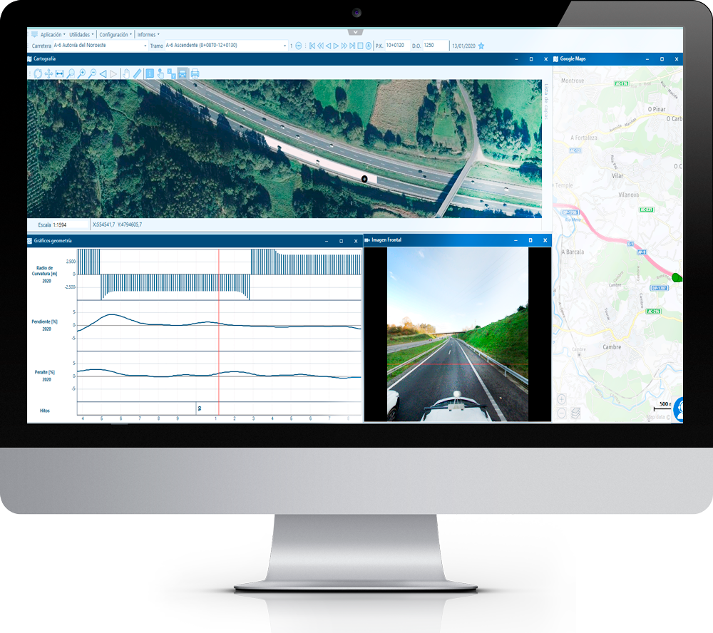 This module displays the geometric data -camber, slope and radius of curvature- of any roadway network in both graphic and numeric formats. Data is obtained by high-performance equipment that measures and records the roadway geometry.